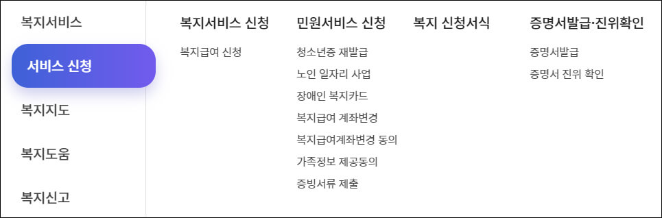 서비스 신청은 실제적으로 복지급여를 신청하는 메뉴로 로그인 후 진행됩니다.