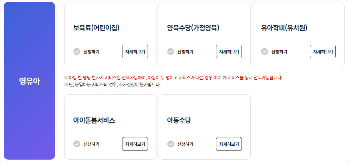 보육료(어린이집), 양육수당(가정양육), 유아학비(유치원), 아이돌봄 서비스, 아동수당을 신청할 수 있습니다. 아동 한 명당 한가지 서비스만 선택할 수 있습니다. 아동이 두 명이고 서비스가 다른 경우에는 여러 개 서비스를 동시에 선택할 수 있다고 하니 참고하시기 바랍니다.