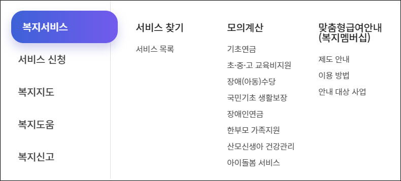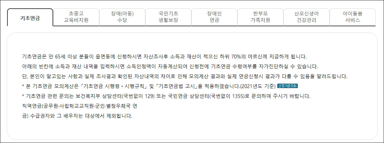 현재 서비스중인 모의계산은 기초연금, 초중고 교육비지원, 장애(아동)수당, 국민기초생활보장, 장애인연금, 한부모 가족지원, 산모신생아 건강관리, 아이돌봄 서비스, 총8가지입니다.