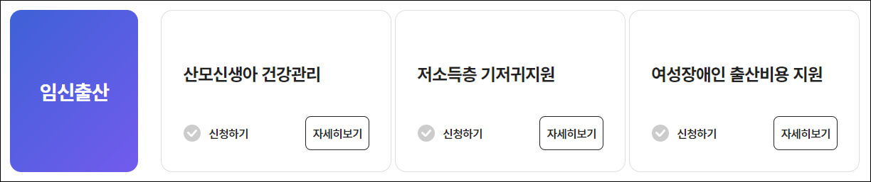 산모신생아 건강관리, 저소득층 기저귀 지원, 여성장애인 출산비용 지원을 신청할 수 있습니다.