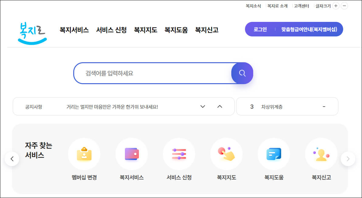 포털 사이트에서 복지로를 검색하거나 아래 링크를 통해 복지로 홈페이지에 접속하면 첫 화면이 뜹니다.