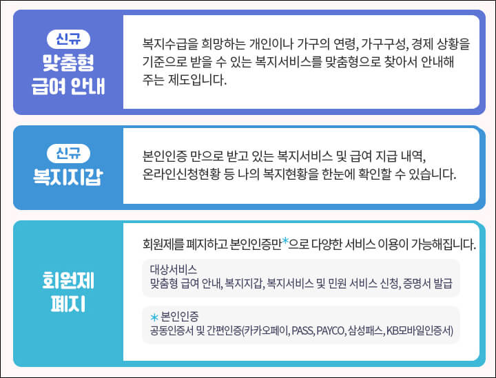 올해 9월 6일부터 복지로 홈페이지에서는 개정된 사회보장급여법 시행에 따라 맞춤형 급여 안내(복지멤버십) 서비스를 제공합니다. 개인이 받을 수 있는 복지 서비스를 문자나 이메일로 안내해주고, 복지지갑 기능을 신설했습니다. 또한 회원제를 폐지해 본인인증만으로 복지로 홈페이지의 다양한 서비스 이용이 가능합니다.