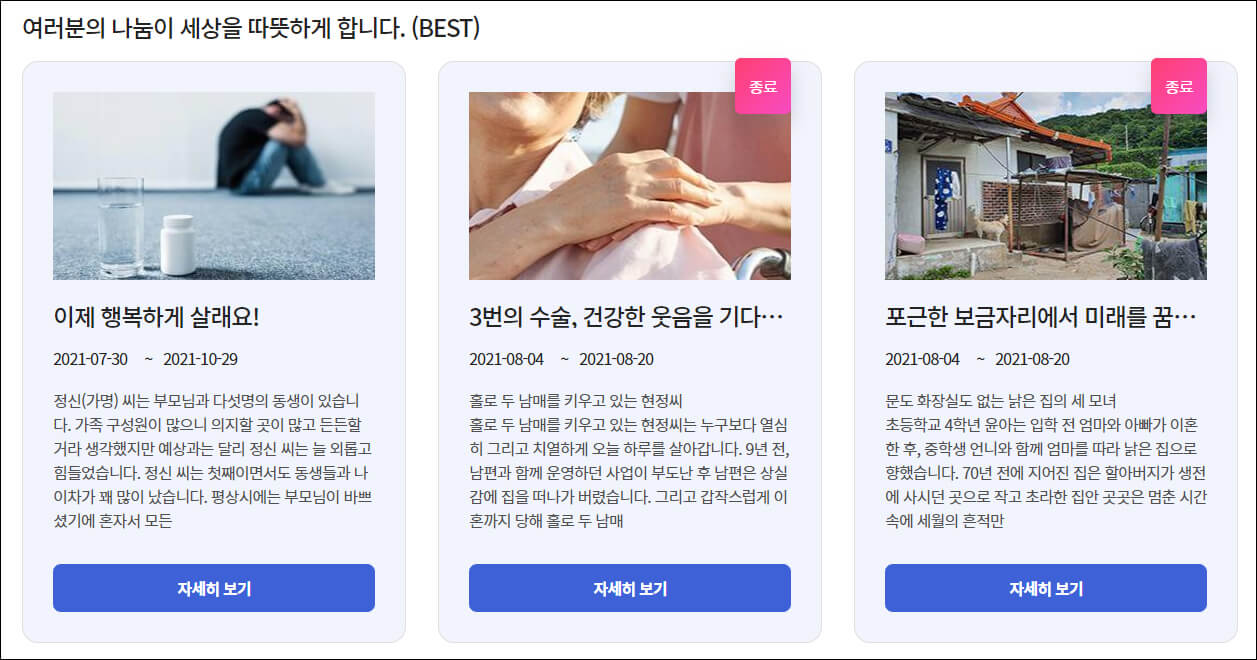 함께도움 코너는 도움의 손길이 필요한 곳에 따뜻한 나눔을 할 수 있는 곳입니다. 함께 하는 협력기관과 함께 진행기간동안 물품을 기증하거나 기부할 수 있습니다.