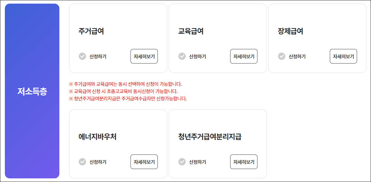 주거급여, 교육급여, 장제급여, 에너지 바우처, 청년 주거급여 분리지급 신청이 가능합니다. 주거급여와 교육급여는 동시에 선택해서 신청할 수 있습니다. 교육급여 신청할 때는 초중고 교육비지원도 동시신청 할 수 있습니다.