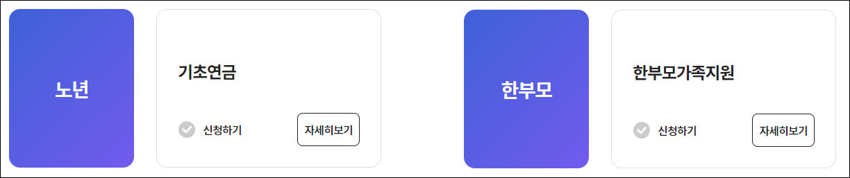 원래는 따로 메뉴가 나오는데 같은 이미지로 묶었습니다. 노년은 기초연금, 한부모는 한부모 가족지원을 신청할 수 있습니다.