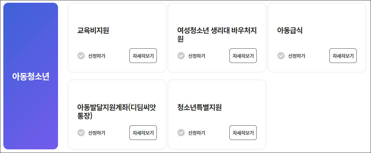 교육비 지원, 여성 청소년 생리대 바우처 지원, 아동급식, 아동 발달지원 계좌(디딤씨앗통장), 청소년 특별지원 신청이 가능합니다.