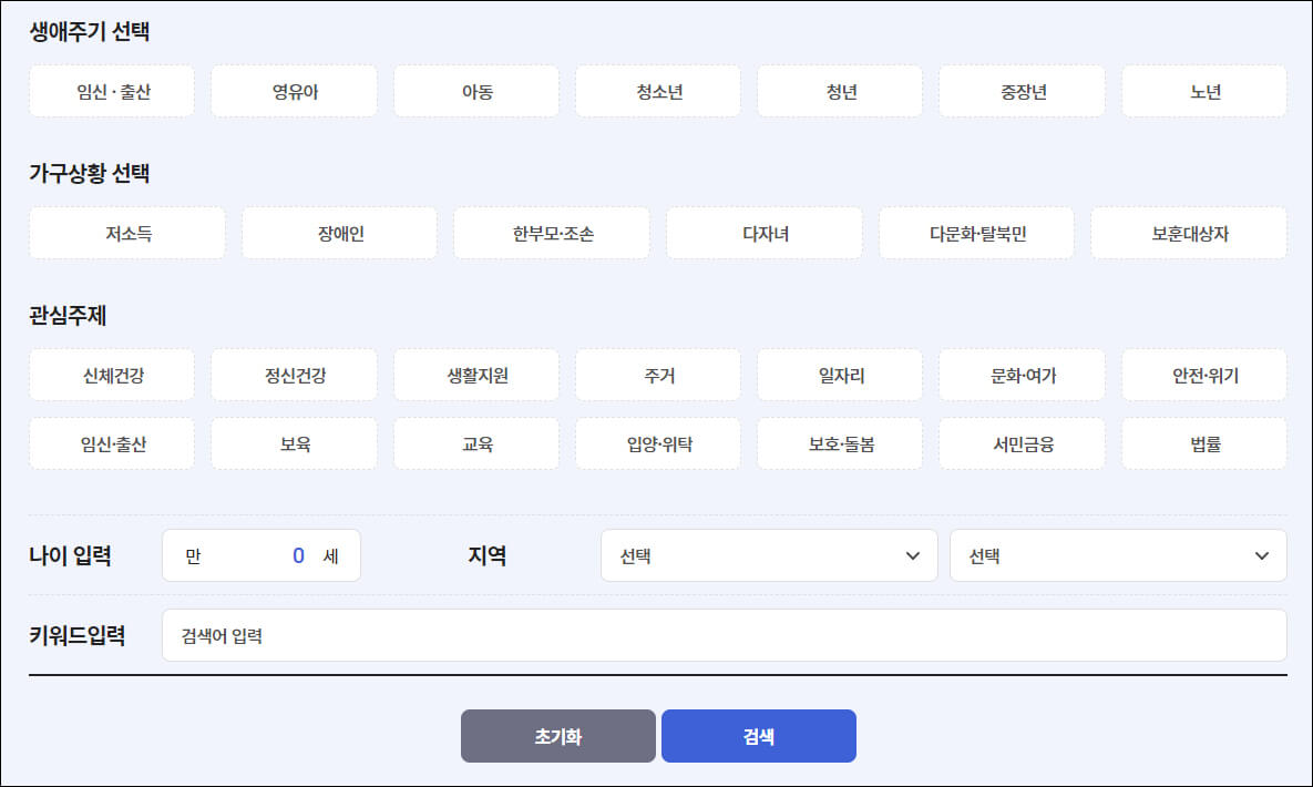 서비스 목록에서는 생애주기, 가구상황, 관심주제에 맞춰 지원서비스를 검색해 볼 수 있습니다. 나이와 지역, 키워드를 입력하면 해당 조건에 맞춰 복지서비스 결과를 보여줍니다.