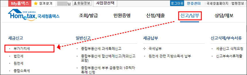 홈택스 홈페이지(https://www.hometax.go.kr/)에 접속해서 상단에 있는 신고/납부 메뉴 중 부가가치세를 선택합니다.