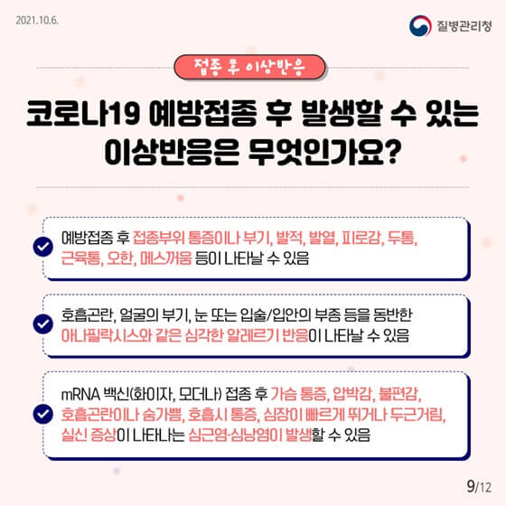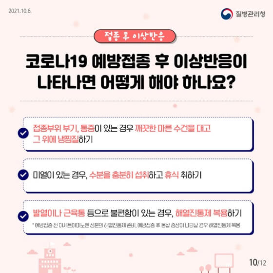 질병 관리청에서 제공하는 카드 뉴스입니다. 코로나19 예방접종 전과 후에 어떻게 해야 하는지 확인해 보시고 해당 증상이 나타나는 경우 부모님은 질병관리청의 지시사항대로 즉시 의사의 진료를 받도록 해주시기 바랍니다.