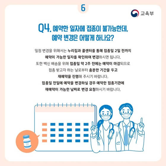 ※ 학생들의 불이익을 최소화하기 위해 접종기간을 4주로 잡았다고 하니 학교의 중간고사, 기말고사 등 평가 상황이 있다면 그 기간을 피해서 신청하는 게 좋을 것 같습니다. 어쩔 수 없이 평가기간에 접종하게 되면 접종후 1~2일이어도 의사진단서나 소견서를 제출해야 출석이 인정된다고 합니다.