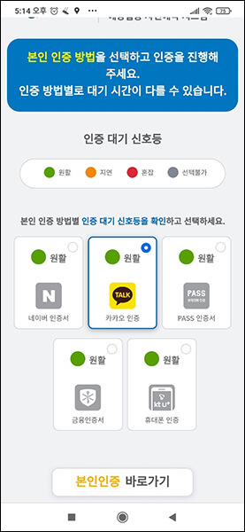 ② 본인 인증 화면이 뜨면 네이버 인증서, 카카오 인증, PASS 인증서, 금융인증서, 휴대폰 인증, 총 5가지 중에서 선택합니다. 미성년자여서 본인명의의 휴대폰이 아닌 경우, 휴대폰 인증 대신 카카오 인증, PASS 인증서 등으로 신청하시면 될 것 같습니다.