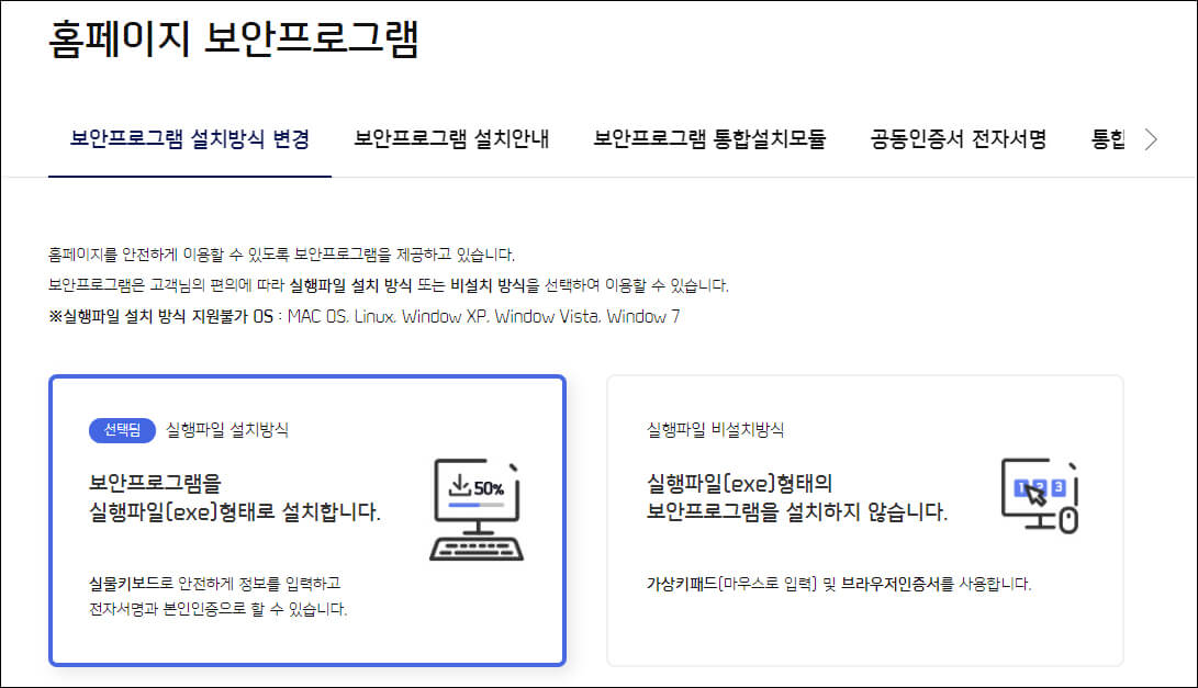 신청하기 버튼을 누르면 보안 프로그램 화면이 나올 수 있습니다. 저는 보안 프로그램을 실행파일 형태로 설치하는 것으로 선택했습니다.
