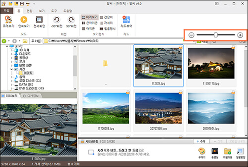 크게 보기, 전체 화면 보기, 연속 보기, 여럿 보기, 압축파일 이미지 보기 등 다양한 사진 보기 옵션을 선택할 수 있습니다. 이미지를 부드럽게 보정해서 볼 수 있고, 사진 자동 회전 기능이 있어서 거꾸로 찍은 디카 사진을 제대로 볼 수 있습니다. 크기가 다른 이미지 파일들을 동일한 배율로 확대, 축소시킨 상태로도 이미지를 볼 수 있습니다.
