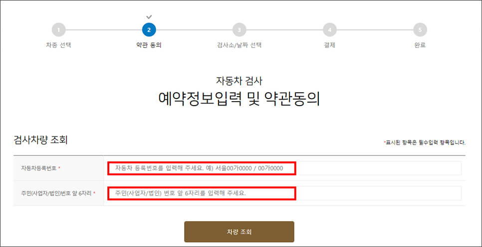 ② 검사차량 조회 시 자동차등록번호는 자동차 번호판 번호를 지역00가0000 형식으로 입력하면 됩니다. 그리고 자동차 소유주의 주민등록번호 앞 6자리를 입력합니다. 만약 자동차가 사업자나 법인 소유인 경우에는 사업자 번호나 법인 번호 앞 6자리를 입력하면 됩니다.