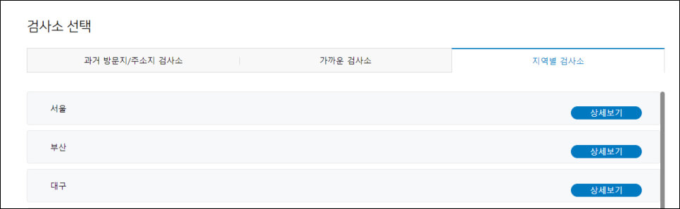 ⑥ 예전에 검사를 받은 곳이 있다면 해당 검사소 정보가 나옵니다. 저는 이번에 지역별 검사소를 선택했습니다.