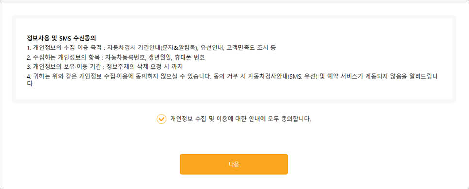 전화번호를 입력하고, 그 밑에 있는 개인정보 수집 동의에 체크한 후 다음 단계로 넘어갑니다.