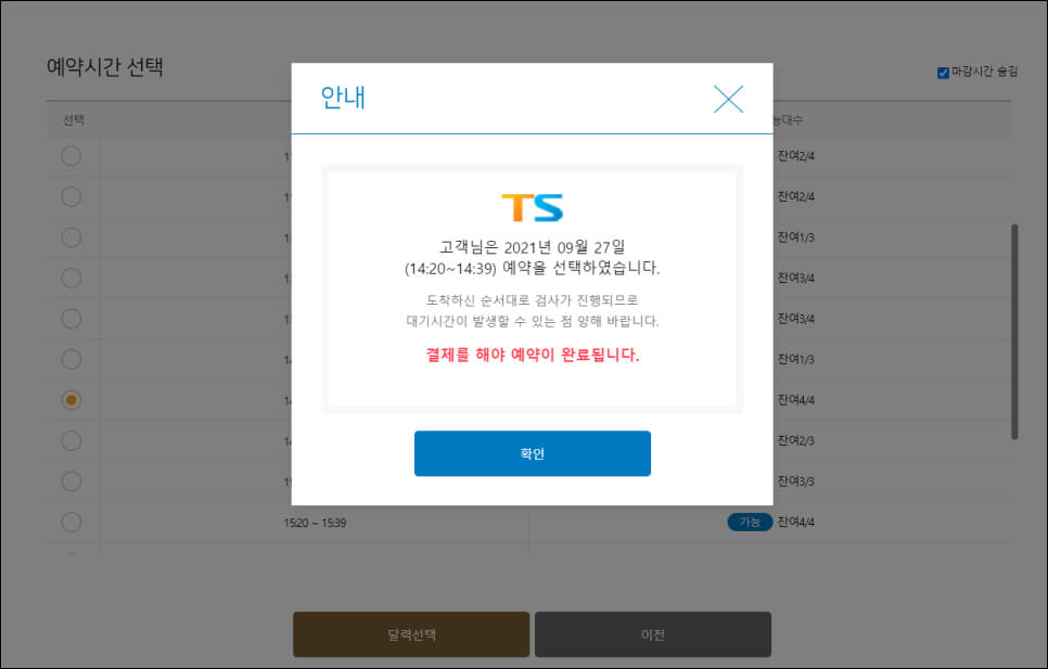 예약 가능으로 뜨는 시간을 선택하면 됩니다.