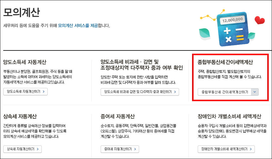 국세청 홈택스 홈페이지에 방문해 세금종류별 서비스 메뉴의 '세금모의계산'을 선택합니다.