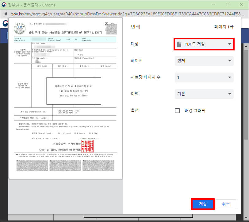 저는 pdf로 저장해서 필요에 따라 인쇄하거나 전자문서로 전송할 때 사용합니다. 인쇄를 원하신다면 연결된 프린터를 확인하고 대상을 프린터 이름으로 바꾸면 하단의 저장 버튼이 인쇄 버튼으로 변경됩니다.