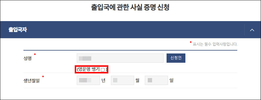 상단에는 발급받고자 하는 이의 개인 정보가 나옵니다. 제출하고자 하는 곳에서 여권명과 대조하는 경우도 있으므로 저는 영문명 병기 옵션을 선택했습니다.