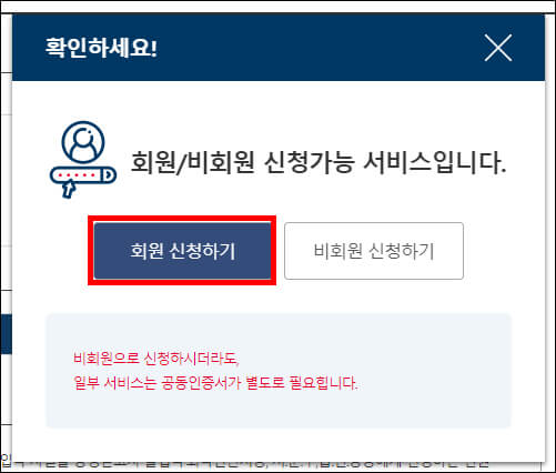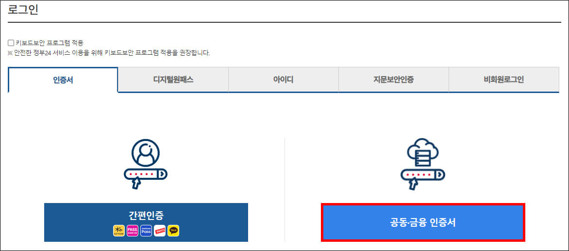 로그인할 때 저는 공동인증서를 이용합니다. 아이디로 로그인하는 경우 나중에 발급받을 때 공동인증서 확인 과정을 거치게 되기 때문에 단계를 줄이려면 인증서를 이용하는 게 더 편리합니다.