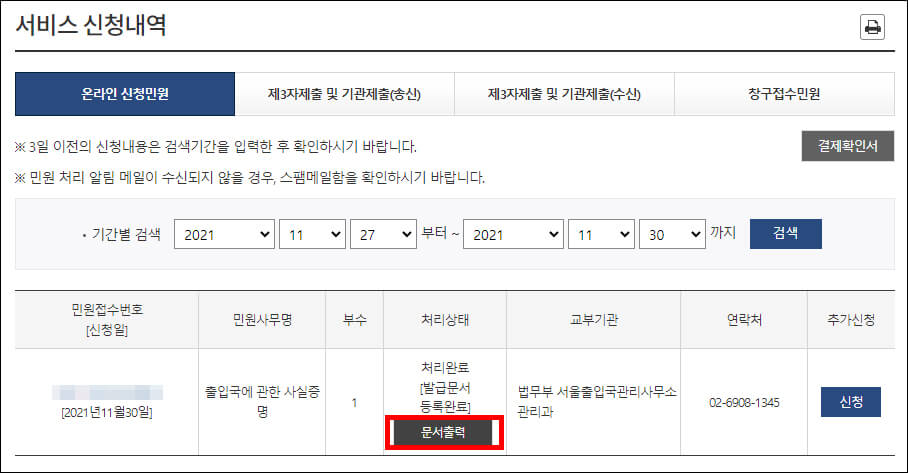 ④ 출입국사실증명서 인터넷 발급 과정이 완료되면 서비스 신청내역이 나옵니다. 민원처리상태에 있는 '문서출력'을 선택하면 인쇄를 위한 팝업창이 나옵니다. 오른쪽의 추가신청 버튼을 선택하면 같은 서류 발급 과정 화면으로 갑니다.