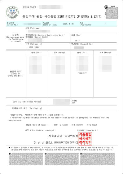 저는 올해 8월에 큰애가 대학교 기숙사 들어갈 때 확인자료로 출입국사실증명서를 제출하느라 발급받았습니다. 기숙사 들어가기 2주 전에 내역이 있으면 코로나19 검사를 받았어도 입소 일정을 뒤로 미뤄야 한다고 합니다. 단체생활을 해야 하는 경우 아무래도 방역에 신경을 쓰지 않을 수 없나 봅니다.