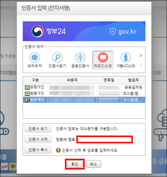 출입국사실증명서 인터넷 발급을 원하는 사람 명의의 공동인증서를 선택 후 암호를 입력하고 확인 버튼을 누릅니다. 공동인증서 하나가 만료일이 얼마 남지 않아서 조만간에 공동인증서 연장 관련 포스팅을 해 보도록 하겠습니다.