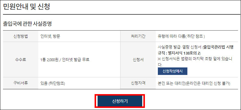 ① 출입국에 관한 사실증명 신청 페이지가 나옵니다. 방문 신청의 경우 수수료가 2,000원, 출입국사실증명서 인터넷 발급은 무료입니다. 하단의 '신청하기' 버튼을 누릅니다.