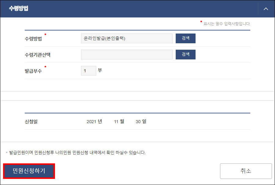 수령방법은 온라인 발급, 발급 부수는 1부로 기본 설정되어 있습니다. 아래의 신청일 날짜를 확인해 보고 민원 신청 시 문제가 생긴다면 상단의 기록대조 종료일 날짜를 하루 전날로 바꾸시면 됩니다.