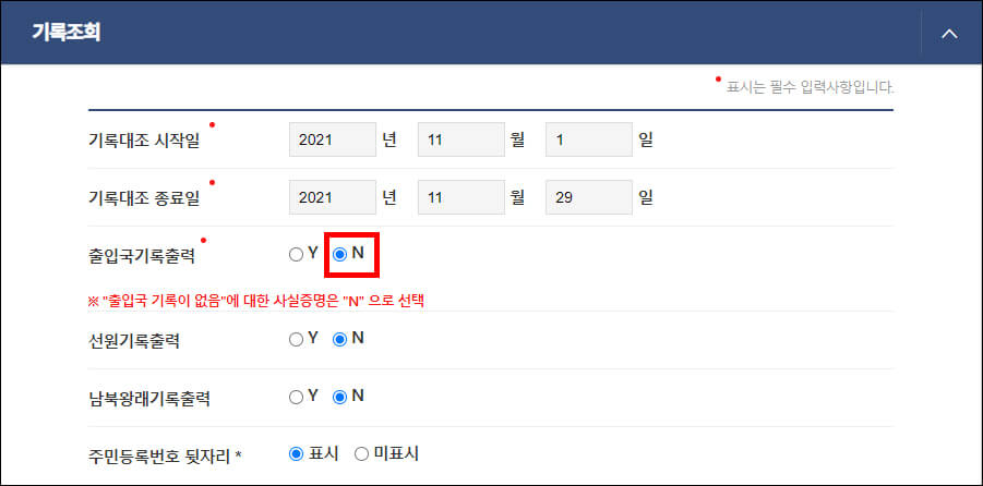 기록대조 시작일은 2021년 11월 1일부터 11월 29일까지로 지정했습니다. 출입국사실증명서는 종료일이 신청일보다 전날인 경우까지만 가능합니다. 그리고 시작일은 본인의 생년월일부터 시정할 수 있습니다.