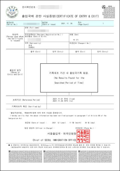 이 기간에는 해외로 출입국한 기록이 없어서 '출입국 기록이 없음'에 대한 사실증명 서류로 받아보도록 하겠습니다.