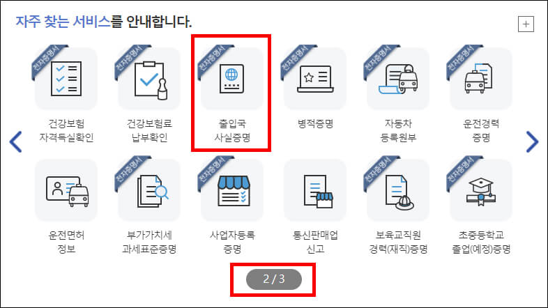 정부24 홈페이지 첫 화면의 자주 찾는 서비스에서도 출입국사실증명서 메뉴를 찾을 수 있습니다. 자주 찾는 서비스 두 번째에 있으니 자칫하면 못보고 넘어갈 수 있습니다.