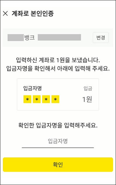 ④ 2차 본인 인증 과정을 거칩니다. 사용하고 있는 은행 계좌를 입력하고, 1원이 입금되면 입금자명을 작성합니다.