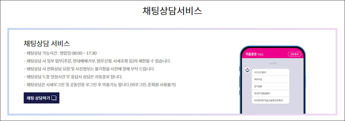 비대면 업무가 많아지다 보니 궁금한 상황이 있을 때 물어보기 어려운 경우가 있습니다. 그럴 때는 채팅상담 서비스를 받으면 좋을 듯합니다. 키움증권 홈페이지 우측 하단에 있는 '채팅상담' 아이콘을 클릭하면 됩니다.